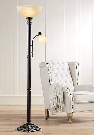 72 Inch Elegant 2 Lights Torchiere Floor Lamp With Amber Glass Shade